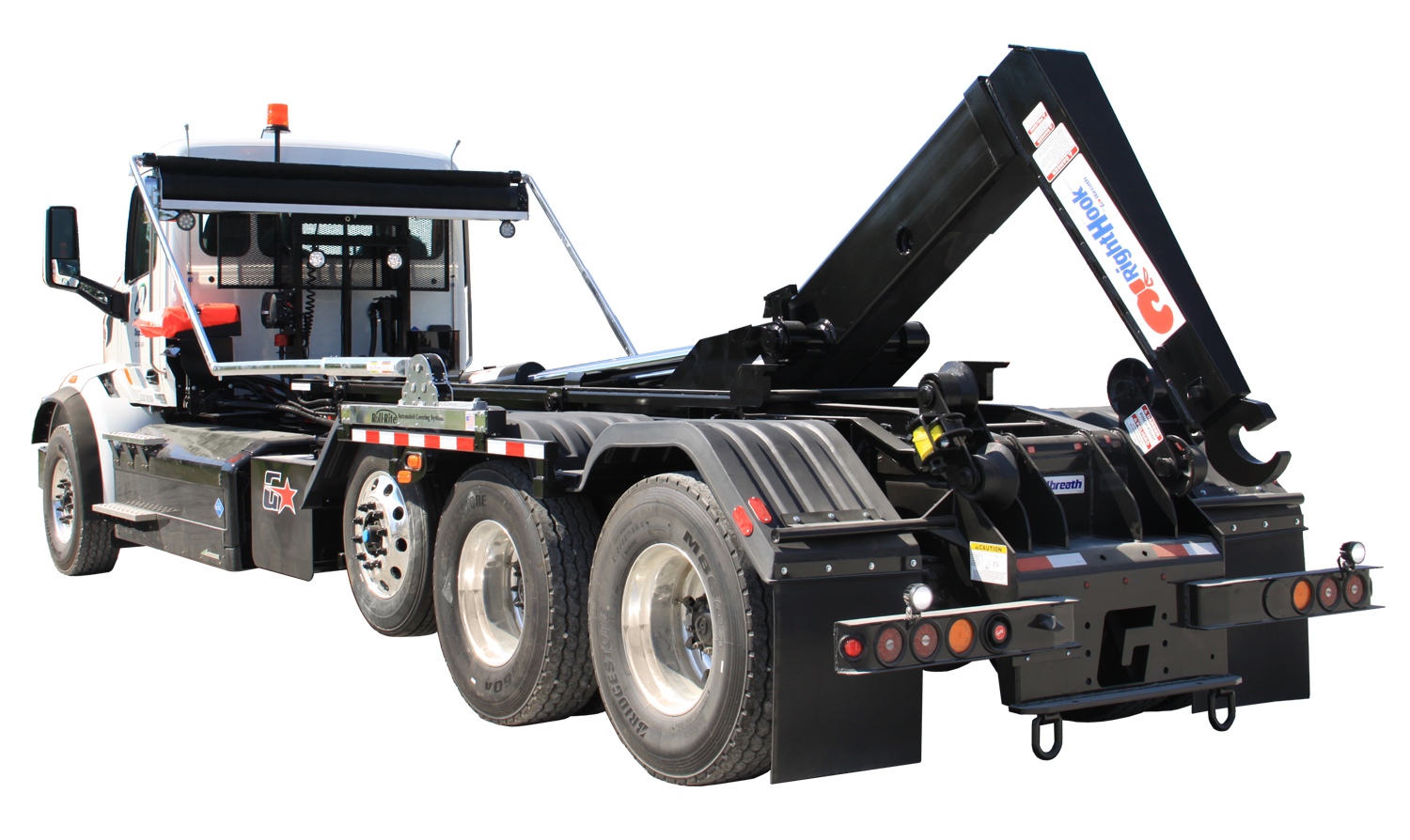 Sistemas portacontenedores de gancho o polibrazo, con capacidad de hasta 75,000 libras, utilizados comúnmente en las operaciones de gestión de residuos donde el espacio es reducido.